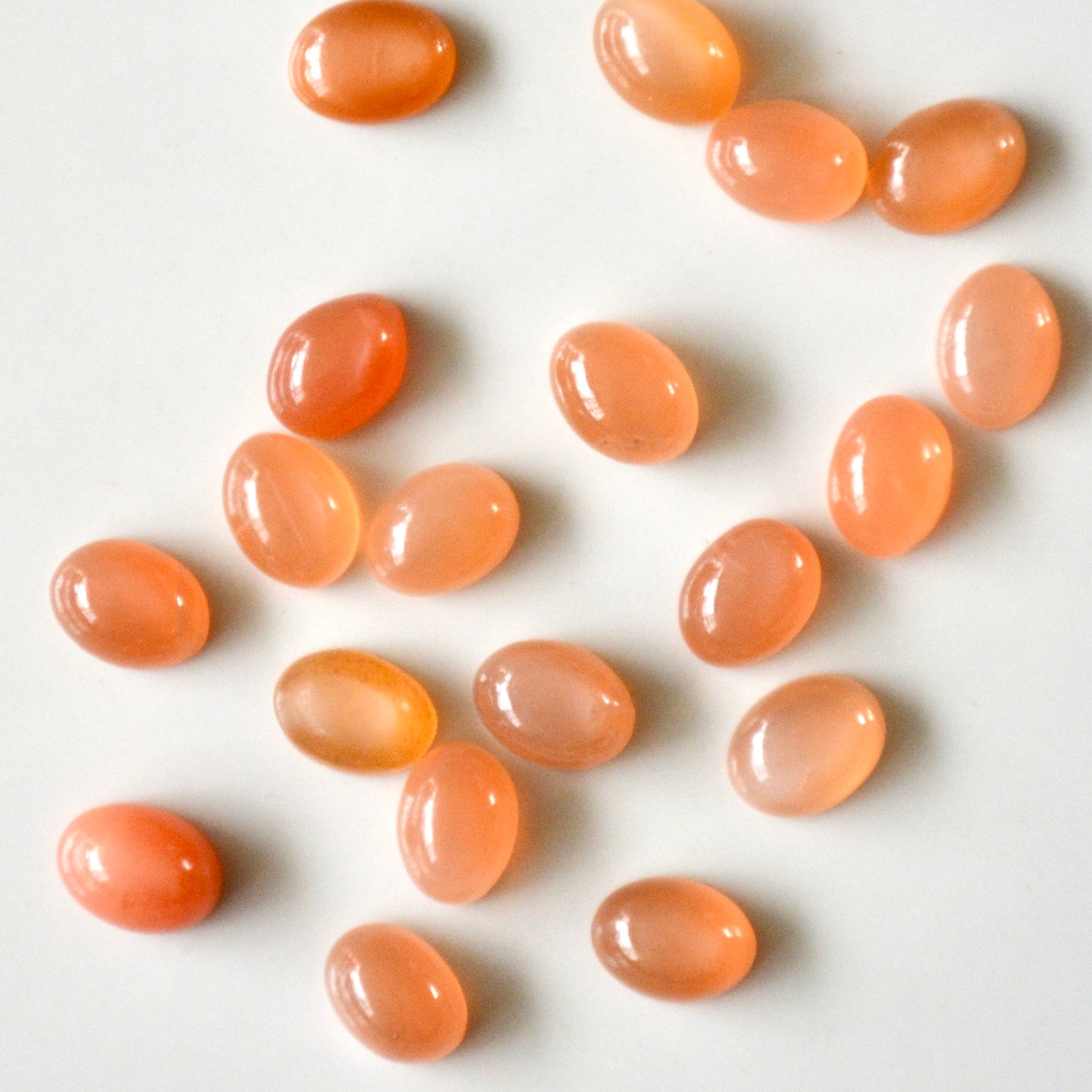 Dieser Cabochon besteht aus rotem Mondstein und hat daher eine sanfte, orange Farbe mit seidigem Glanz. Der Cabochon ist oval, glatt geschliffen und 8x6 mm groß.